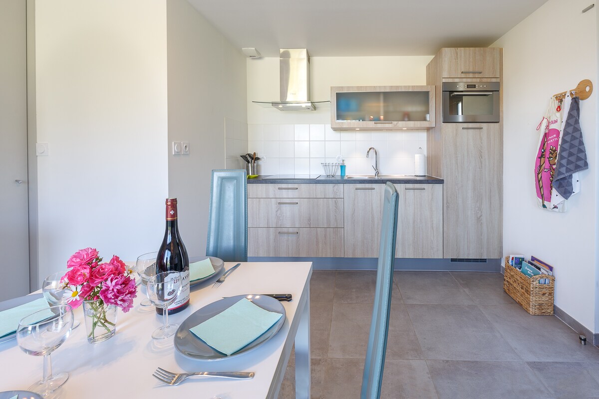 位於錫涅 (Chignin) 的舒適公寓,附露台和陽台 描述: 位於薩瓦葡萄園中心的錫涅 (Chignin) 39 平方公尺公寓。露台和陽台,可欣賞山景。非常適合享受大自然! 空間: 客廳配有沙發床、電視、Wi-Fi。 設備齊全的廚房(烤箱、冰箱等) 臥室(床 140 公分)。 浴室,包括毛巾。 免費停車 優勢: 靠近葡萄園 滑雪和布爾熱湖 博熱山徒步旅行。 距尚貝里15分鐘。 資訊: 2-4 人 自助入住。 包含清潔服務。