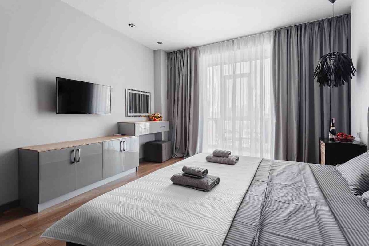 🏙️位於18層樓的18樓。 🕓 24小時全天候入住! 即使深夜抵達,亦無需擔心 🌙 ❗所有床上用品均在乾洗店進行專業清潔! ❗室內避難所! (地下停車場) 💰 價格包括: 🛏️舒適條紋緞面床單 🍽️ 所有餐具和廚房用具 🩴 即棄拖鞋 🧼 香梘和沐浴露 🌐高速Wi-Fi互聯網 ☕️意式濃縮咖啡機+咖啡 🍵 袋裝茶品