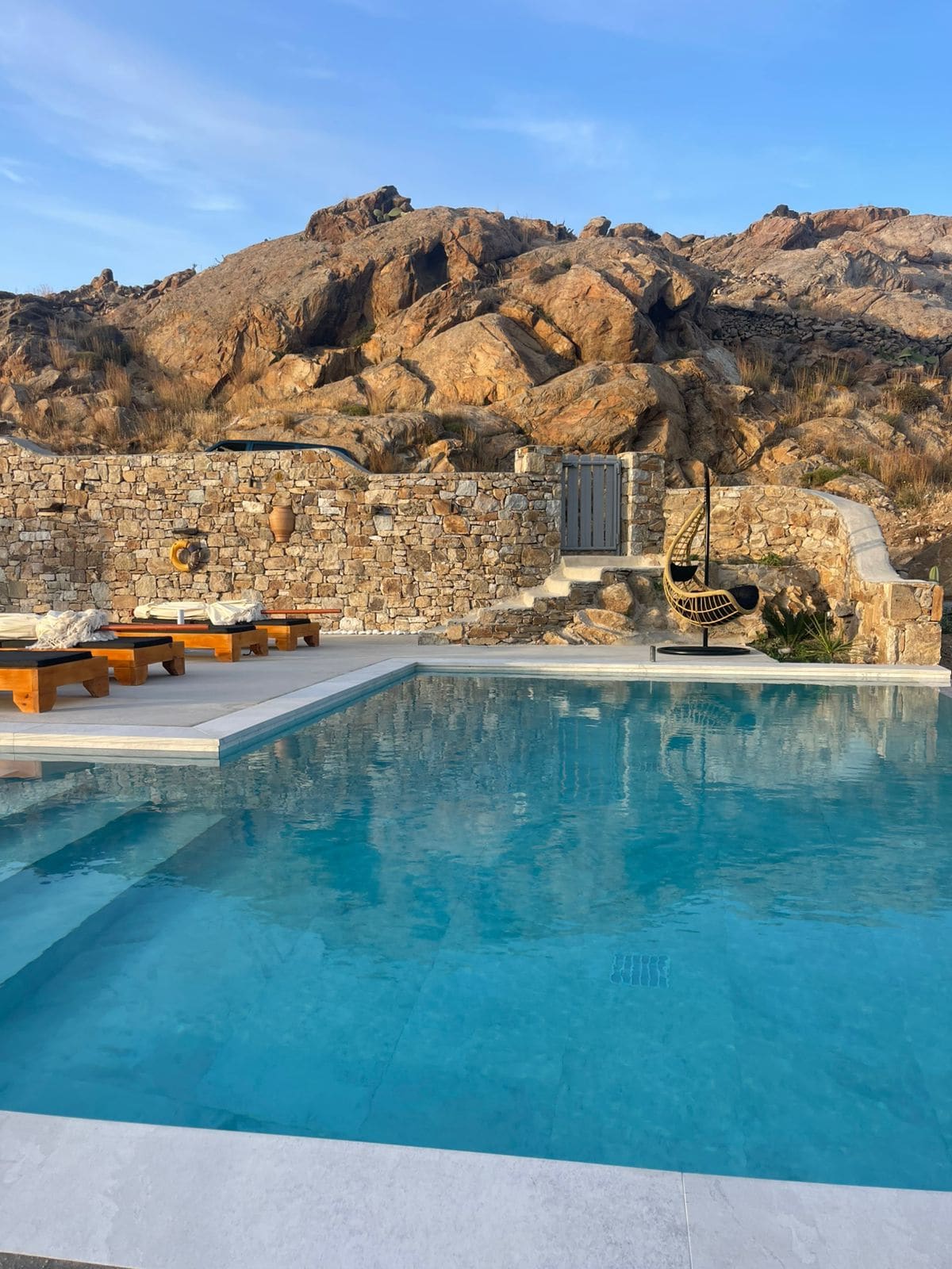 39 m² luxurious suite+ 45 m² patio with private pool, outdoor Jacuzzi for 3, and panoramic sea view. Includes queen bed with anatomic mattress, goose-feather sofa (sleeps 1 more), full kitchen, 55” Smart SAMSUNG TV with free Netflix, and Bluetooth Hi-Fi SONY sound system . Large furnished terrace with outdoor dining and Cycladic flair. Enjoy full privacy, 5-star comfort, and concierge support. Ideal for couples or small families seeking a stylish, private and extraordinary unique Mykonos escape.