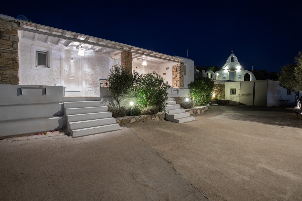 This 4 bedroom amazing house is situated moments from Ornos beach, the famous windsurfing/kitesurfing beach of Korfos and Mykonos town is only 3 minutes drive away or a 25-minute walk. There is view to the Aegean sea and Korfos beach & The house accommodates 8 guests One of the 4 bedrooms is situated outside the main house and has complete privacy along with beautiful sunset and sea views.