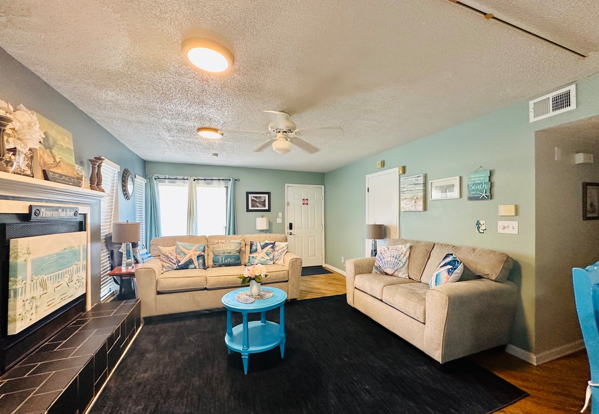 Welcome to your beach condo! Just two blocks from the ocean in a quiet community, this charming 2-bedroom, 2-bath retreat features coastal décor, three TVs (2 cable, 1 Wi-Fi), a master suite with dual vanities and a jacuzzi tub, plus in-unit washer and dryer. Enjoy the spacious living area and fully equipped kitchen with breakfast bar, perfect for relaxing after a day at the beach.