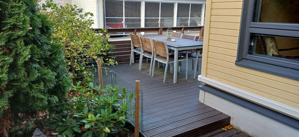 該房源位於Rymättylä的中心,擁有自己的大型寧靜花園。 地面閣樓、壁爐房、廚房、桑拿房、馬桶和大型後露臺,配有燒烤設施和戶外熱水浴缸。 該物業設備齊全。 此房源非常適合參觀Moominworld的家庭、婚禮情侶、尋找自己的奢華時光、遠程工作,甚至騎自行車遊覽小環路。 可容納4 +3人。