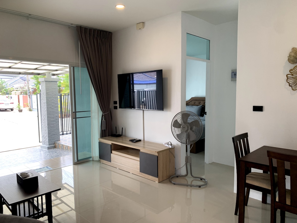 Lovely new house, 15 Minutes walk to the beach, with 2 bedrooms 2 bathrooms. A full Kitchen with cooking facilities, full size fridge, Oven, Dining room, Full living room, Sofa Turns into bed for 2 people if needed Wifi Our house is 3 min from Phuket airport by car, in a nice friendly Thai Village, meet the local Thai people. There are fresh Markets, Restaurants, Grocery stores all with in walking distance. you can have dinner with your feet in the sand We have a private boat tour car rental