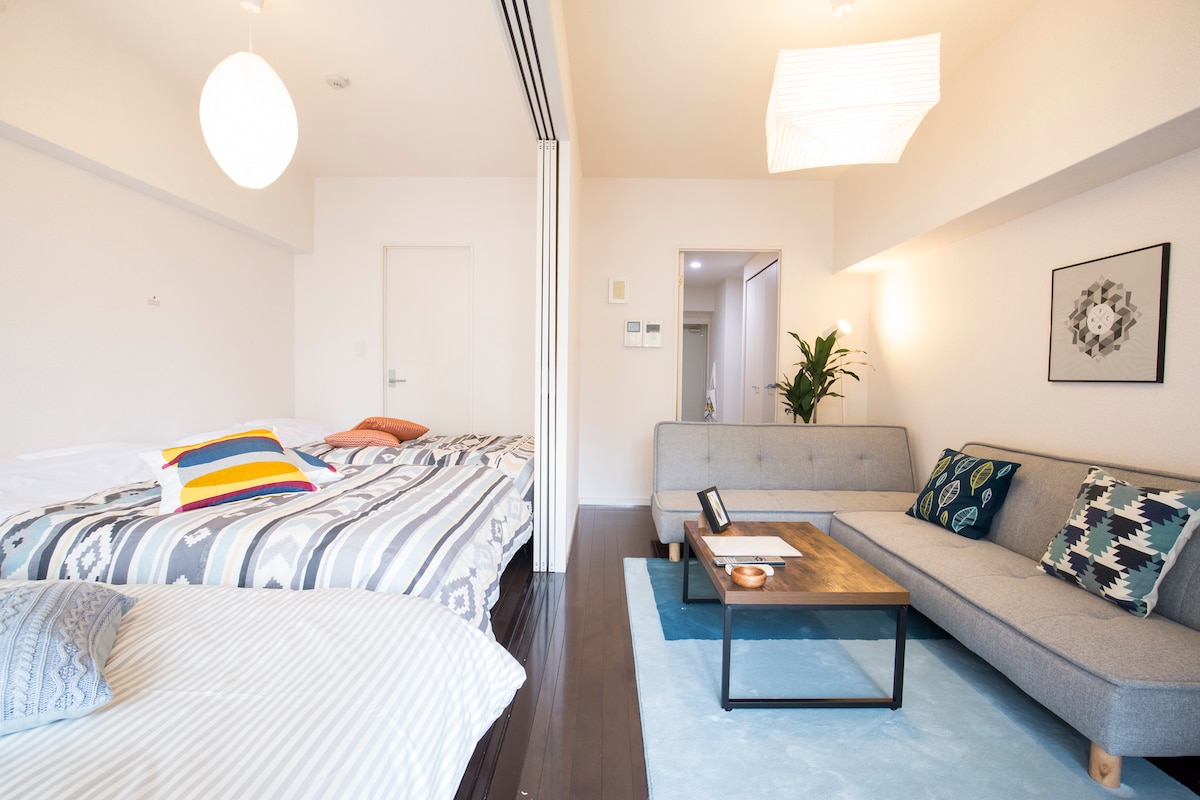 距離福岡「天神地鐵站」步行5分鐘。改建公寓的一個房間。1 張雙人床和 1 張沙發床。