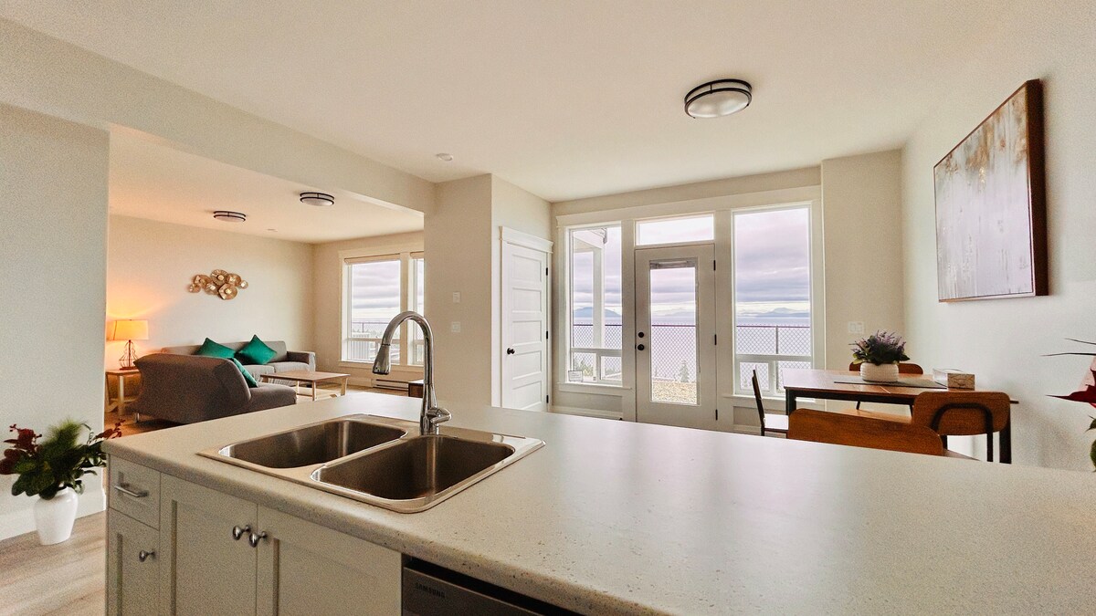 我們的套房是一間令人驚嘆的新建單臥室度假屋,擁有9英尺高的天花板和寬敞的810平方英尺空間。配有58吋智慧電視和設備齊全的廚房,確保您在旅行期間享有高品質的生活方式。從私人陽臺上欣賞令人驚嘆的日出和日落,欣賞喬治亞海峽對面的壯麗海景和山景。我們的套房位置方便,是探索溫哥華島魅力的理想基地。