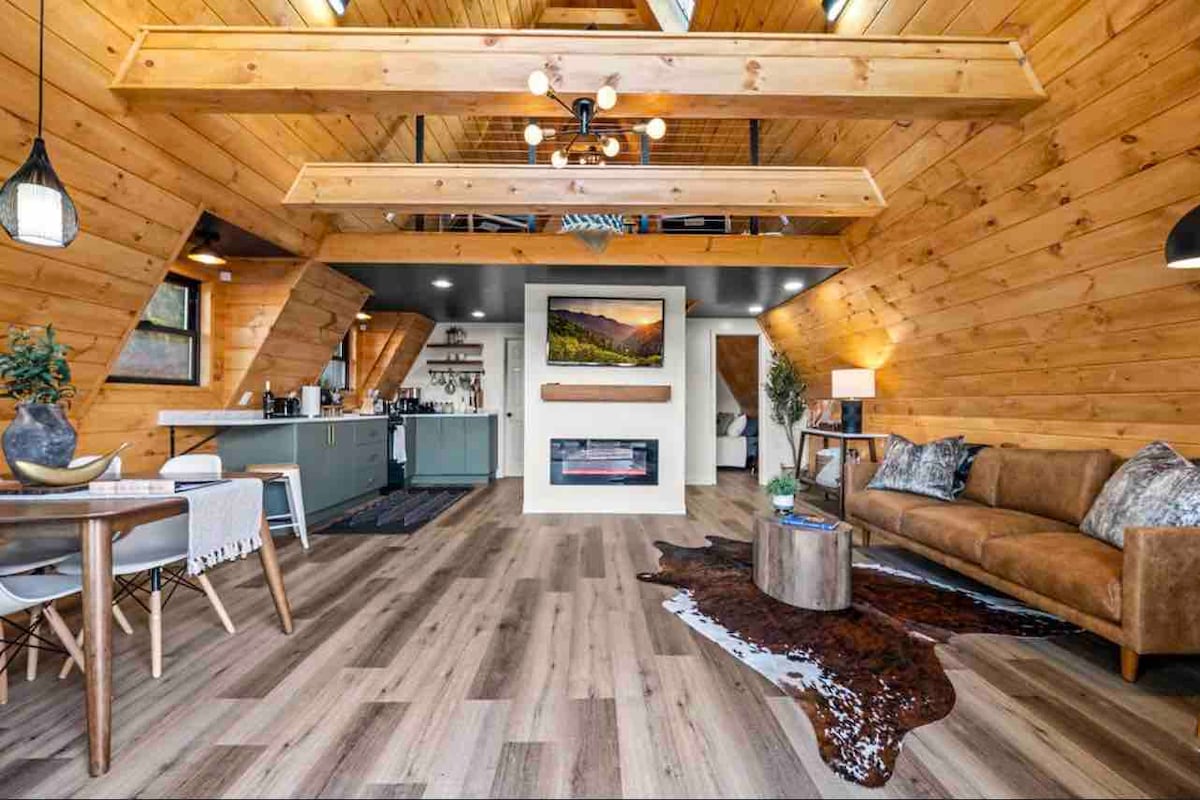 Red Shed A-Frame可欣賞煙山的美景,已被翻新成獨特的私人綠洲! 距離市區不到10分鐘! 私人和僻靜的戶外天堂,包括按摩浴池、涼亭、酒吧和戶外淋浴間。 營火設施、蛋椅、燒烤設備、大露台、繩球。 你永遠不會想離開! 室內有美麗的Parklin Interiors設計空間、全新廚房、咖啡吧等! 配有加大雙人床的大Loft,可欣賞景觀,樓下有第二間舒適的雙人床臥室。