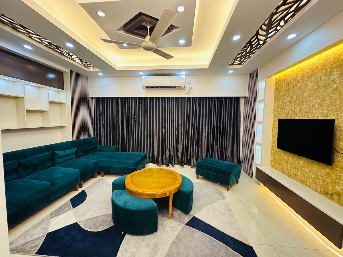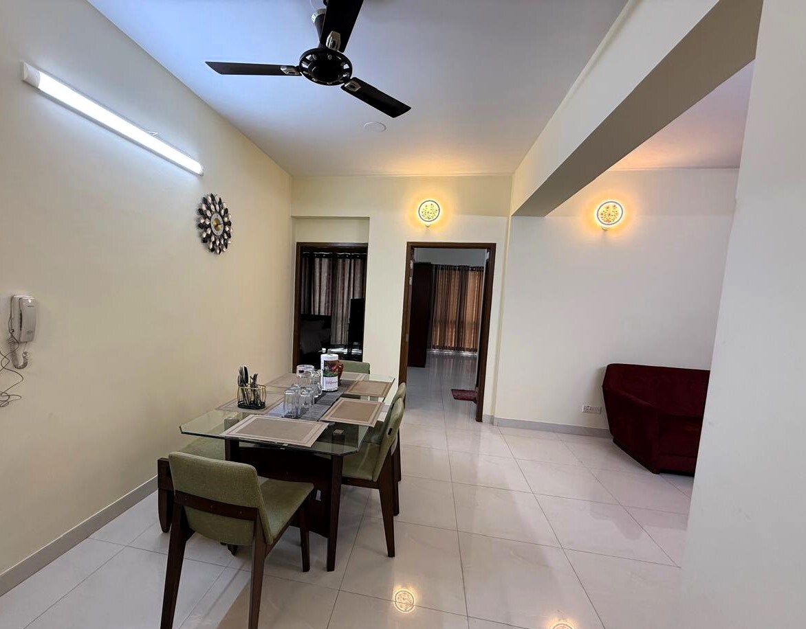 The spacious 1650 sqft apartment is tastefully furnished and decorated with a large living and dining area, three bedrooms with two balconies, three bathrooms, and a fully equipped kitchen. Guests receive complimentary bottled water at check-in; additional water must be purchased. House help can be arranged on request, with costs paid by guests. Located in an upscale area near Jamuna Future Park and Evercare Hospital, with cafes, restaurants, and the airport just 5–15 minutes away.