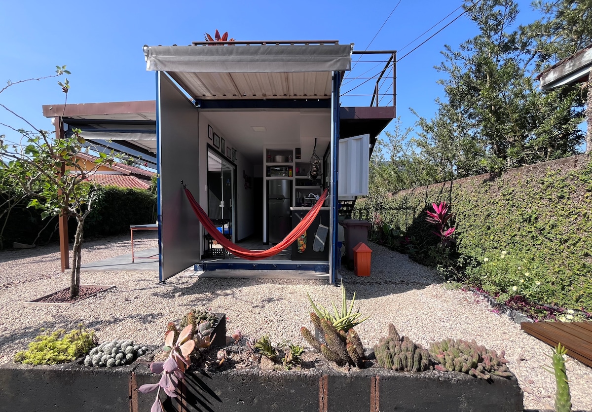 Suíte container confortável com acomodação para 5 pessoas. Área comum rústica para lazer e cozinhar refeições, com fogão, geladeira, freezer, mesas, sofás e sillas, utensílios. Fica próximo a praias, trilhas, cachoeiras, restaurantes, centro de saúde e outros centros urbanos. Para grupos de mais de 5 pessoas podem alugar em conjunto com airbnb.com/h/harmoniajkl-suitescontainer. Container room with kitchen outdoor. Near beachs, falls,tracks nad great landscape. Bird´s watching and sea animals.