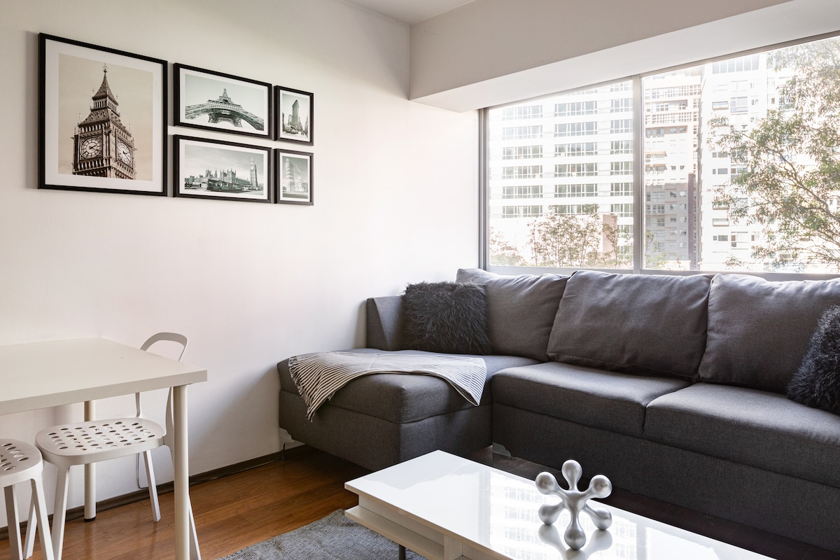 新裝修的公寓,配有新家具。享受設備齊全的廚房、高速網路、舒適的加大雙人床和沙發床,以及兩臺電視,景觀極佳。公寓提供24小時保安服務、可欣賞城市全景的美妙泳池、設備齊全的健身房、遊樂場和烤肉區。探索附近的Soumaya博物館、雜貨店、Antara購物中心、各種餐廳和充滿活力的Polanco街區。