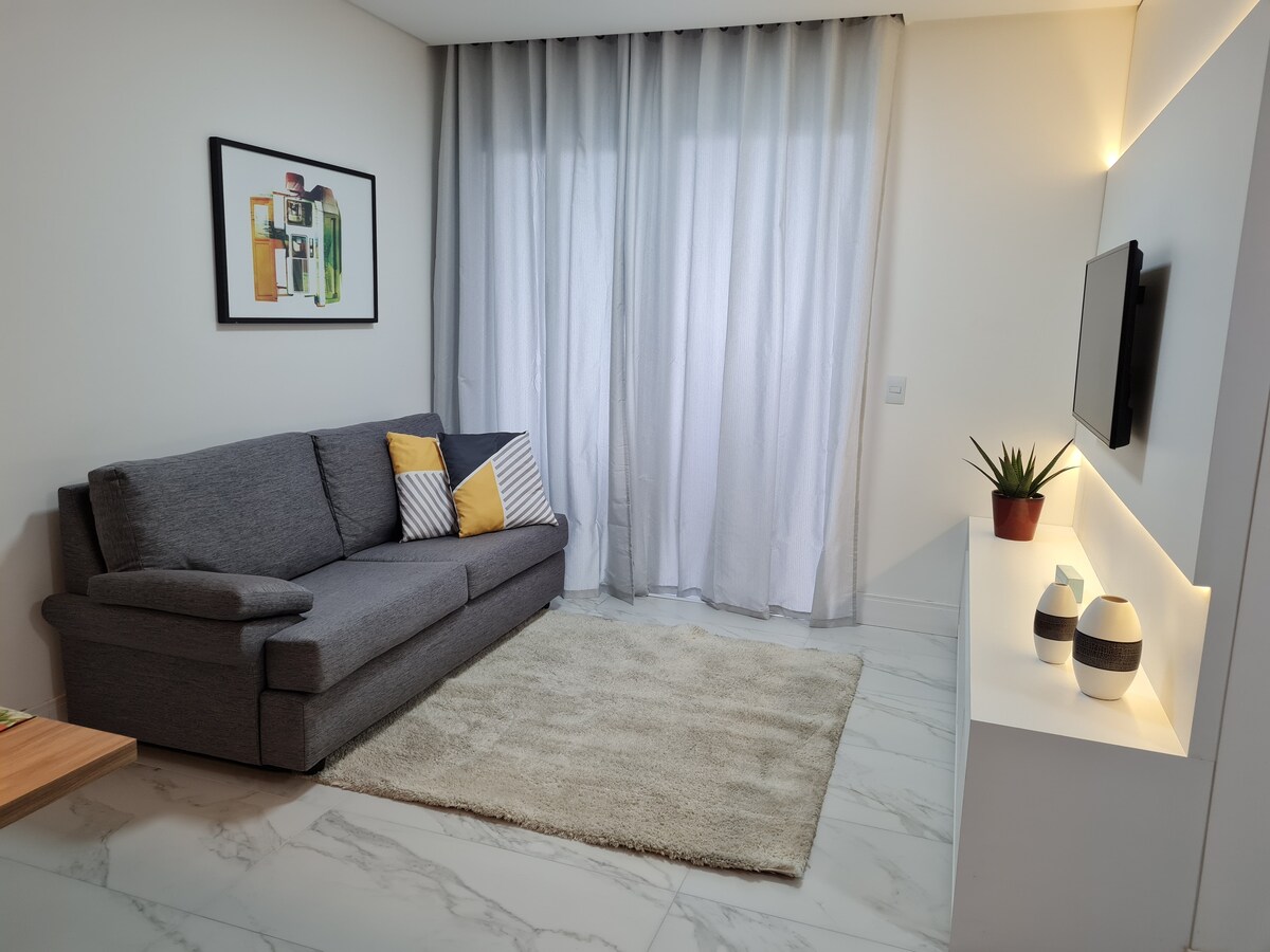 新公寓,配備日常生活所需的所有用具。 位於Bairro Fazenda,設有私人車庫,距離海灘1公里,距離Giassi超市和購物設施300米。 輕鬆前往巴爾內阿里烏,距離著名的布拉瓦海灘僅4公里,毗鄰國際機場。 Beto Carreiro約30公里 公寓有冷氣(冷)、床上用品、浴缸、枕頭和床單。 設有餐具、刀具、鍋具、爐具、微波爐、雪櫃的廚房