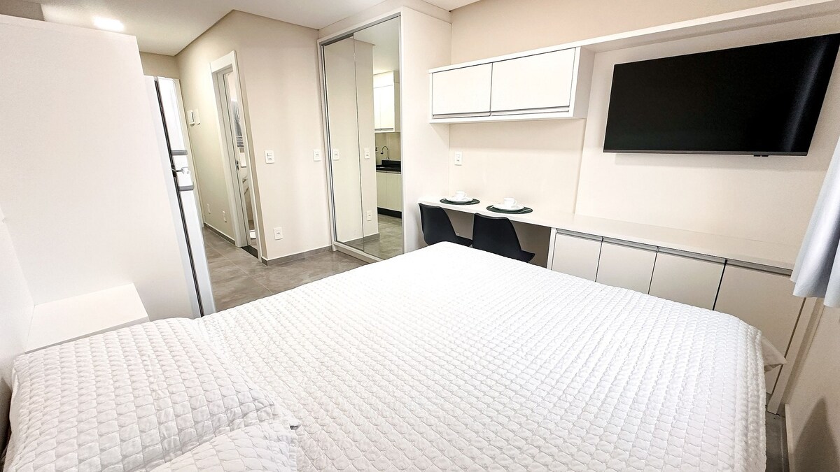 Sofisticado公寓單間公寓距離Vila Germânica Park 800公尺,這是一個活動場所,如慕尼黑啤酒節。 周圍有餐廳、酒吧和超市。 一切都是為了您的舒適: 50英寸三星智慧電視、分體式空調、燃氣淋浴間、240mb光纖WiFi、配備Brastemp冰箱、微波爐、烤箱、爐竈、靴子、咖啡機、淨水器、洗衣機和烘乾機、衣櫃,當然還有一張配有最佳牀墊的迷人標準雙人牀!