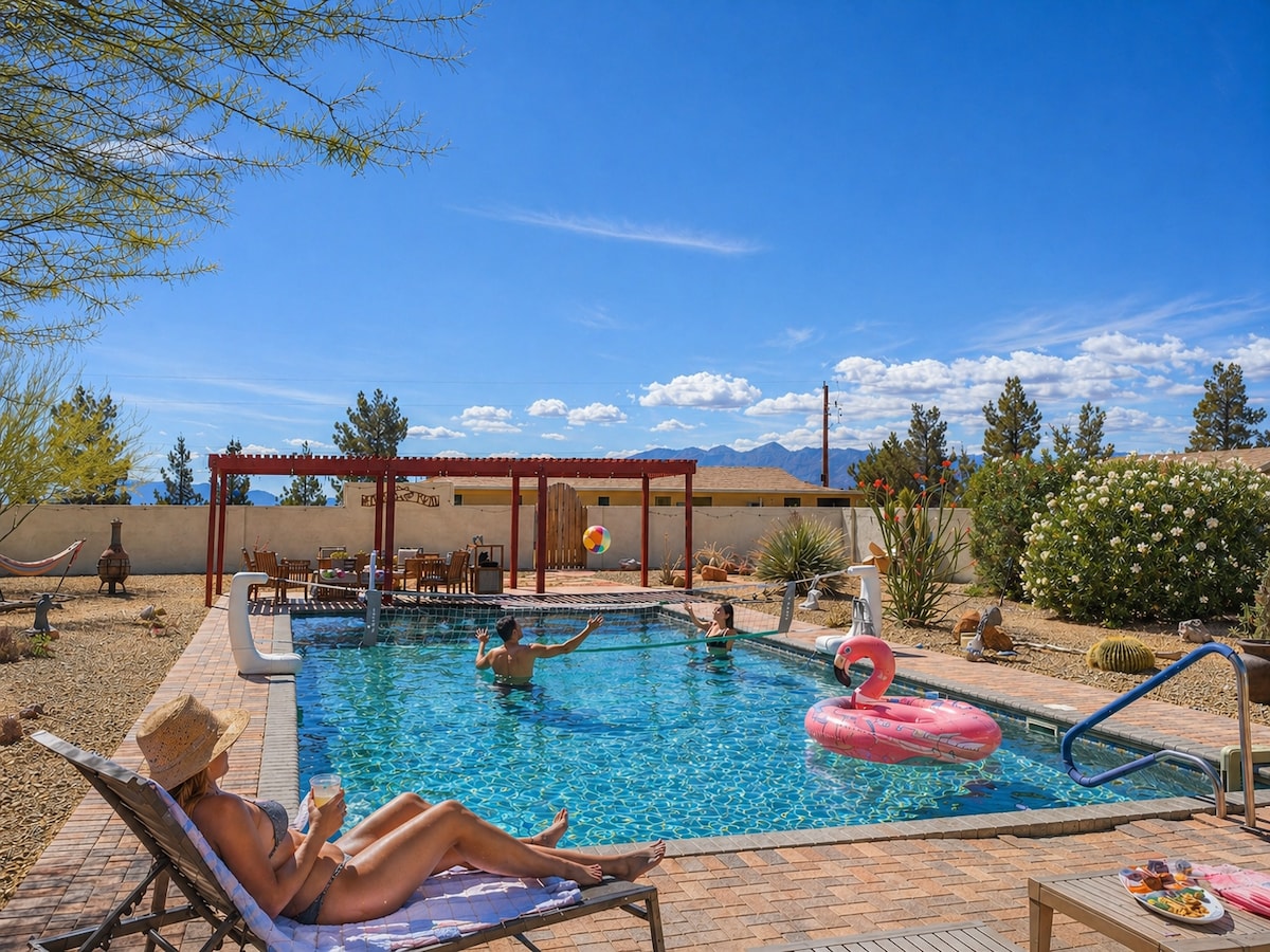 我們美麗的 Cabernet Cabana 泳池小屋位於莫哈韋沙漠(Mojave Desert),距離 Charleston Peak 酒莊僅幾步之遙,是你和同行旅人理想的度假勝地。 這間 1,400 平方呎的泳池小屋可舒適地容納 6 人,配備私人泳池和按摩浴缸,並提供充足的室內外空間。 這間泳池小屋坐落在一個佔地 1.5 英畝的高級社區內。 我們住在主屋。 我們的物業非常安靜、僻靜,並有圍牆圍繞。 有很多活動可做,包括桌球、飛鏢、馬蹄鐵、遊戲等。