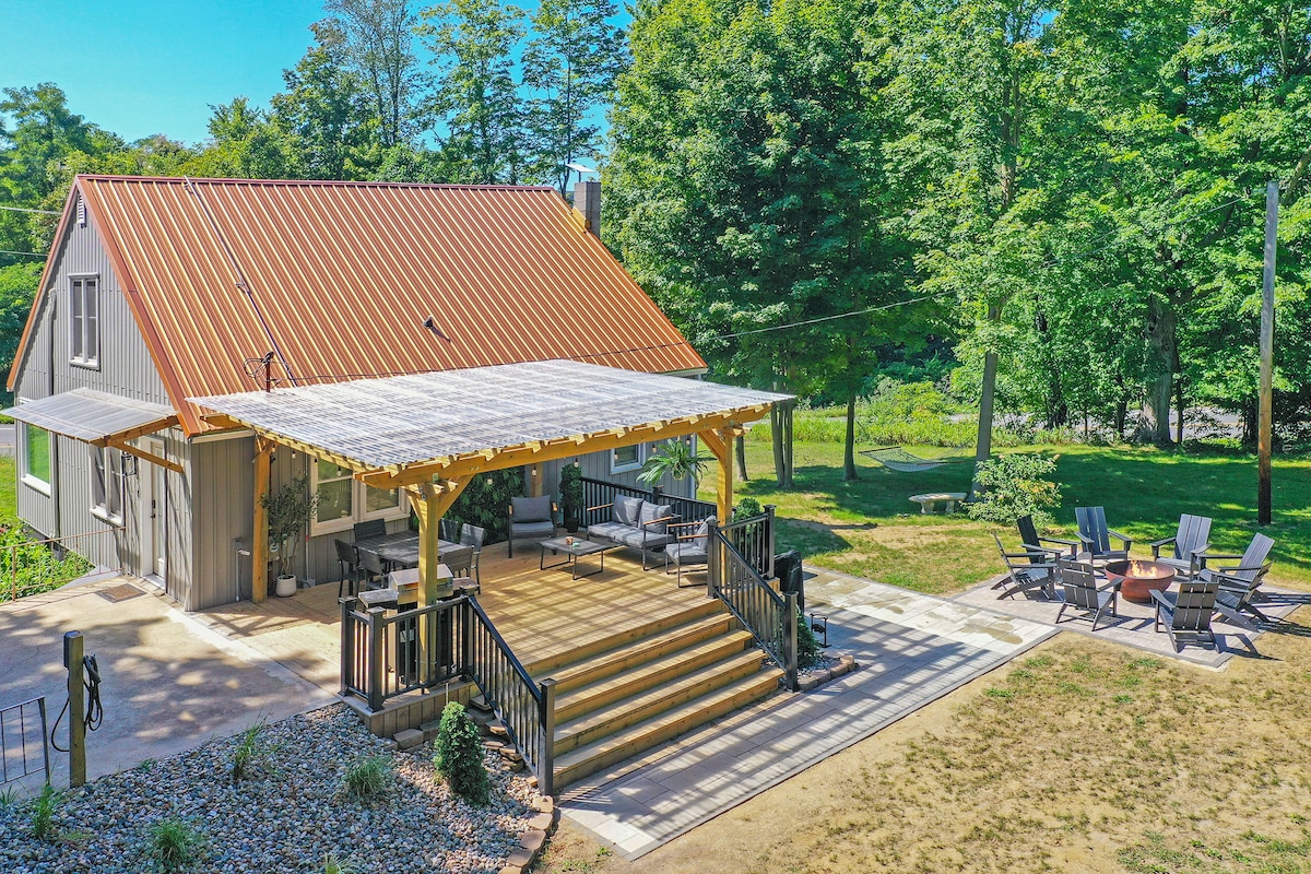「Tiny House」客用住房位於靠近海灘的大橡樹下,距離I-94和密歇根州線不遠。 拱形天花板,開放感。 明亮的裝飾。 全套浴室、舒適的沙發和其他設備與服務。 拋光混凝土地板、白色粉刷的船板天花板、手工製作的橡木家具、懸掛式置物架。 高高的天花板、朝南的窗戶、前門廊、座椅和烤架。 方便的電動車充電器。 永遠不收取清潔費。