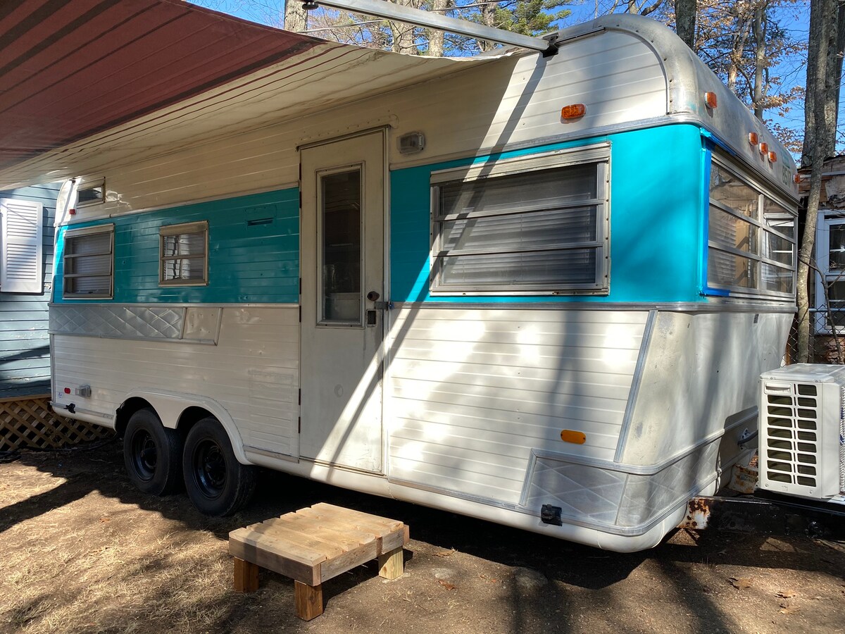 來體驗這個在鄉村林地環境中精美修復的1969年復古露營車。位於湖泊地區,靠近徒步旅行、遊泳、蘋果果園以及熱門餐廳。距離波特蘭僅1小時,距離波士頓僅1.5小時。露營車位於一個私密安靜的7英畝農場上。太陽能供電,備有備用電源。露營車有馬桶、非常小的淋浴間、水槽、爐台、冰箱和小微波爐。露營車很小,有一個小浴室,但很舒適。LGBTQ +友好。