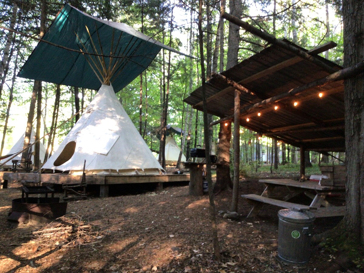 我們提供美麗、舒適的露營選擇。我們的離網帳篷配備了所有舒適的家居設施,包括木爐和閱讀角落!它坐落在鐵杉樹林中,可俯瞰活躍的海狸池塘。步行小徑和當地活動近在咫尺。 如果您有小船或皮艇,請帶上它們!我們在院子裡有空間,也有許多當地的地方可以讓您充分利用。請勿在我們的池塘上使用。我們有船可供使用。