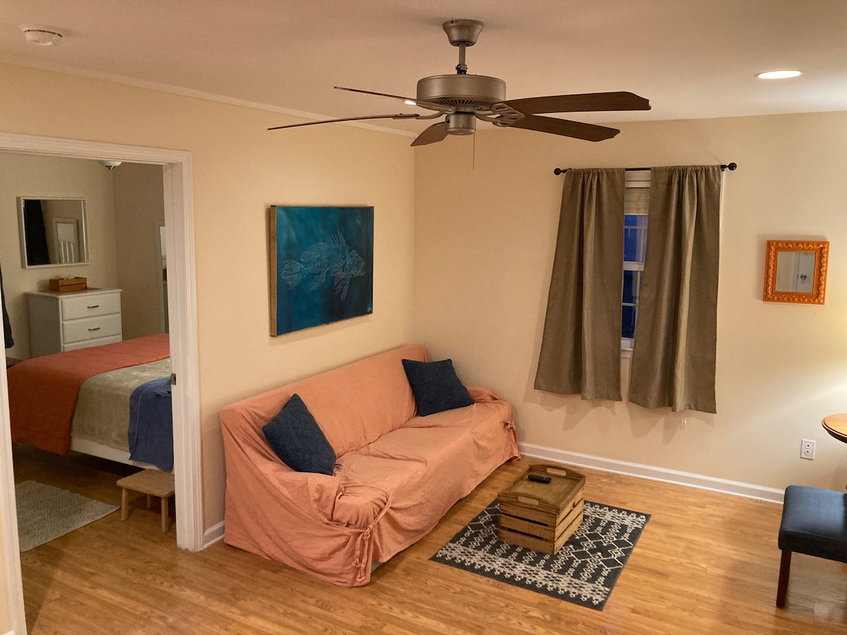 這間客用套房由一間臥室(加大雙人床)和全套浴室組成。獨立入口位於前門廊,空間與房源其他地方隔開。 空間不包括客廳或廚房。但有小冰箱、微波爐、咖啡機、舒適的起居空間和大門廊可供放鬆。 房間內還有一台空氣淨化器,配備HEPA過濾器,可去除空氣中99.9%的所有顆粒。 空間大小為平均酒店房間大小。