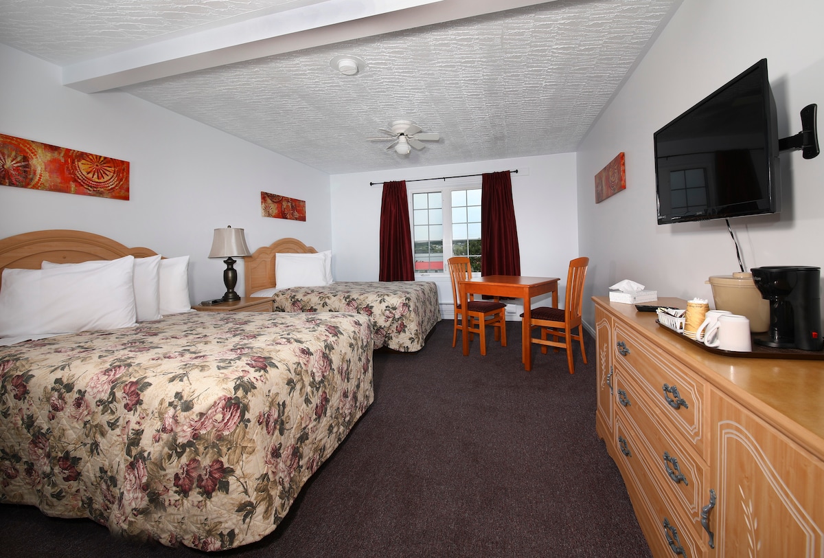 這間客房位於巴斯克港( Hotel Port aux Basques )的一樓。 這間套房包括兩張雙人牀、兩間獨立浴室和一間廚房區域。