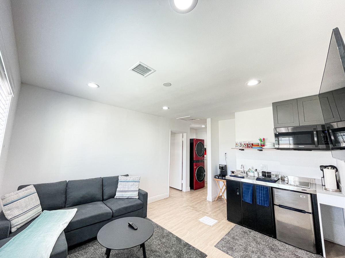 This is a cozy (700sq ft), remodeled, single level one bedroom duplex with one bathroom. Just steps to the sand and 4 blocks to Main Street and the pier. The property is a quiet bungalow surrounded by cozy cottages and magnificent mansions. Fully equipped with microwave, dishwasher, stove and refrigerator. Beautifully furnished and tastefully decorated! This is a 1 bedroom with a king bed, trundle bed and a queen size sofa bed in the living room. Includes 1 garage space with washer and dryer