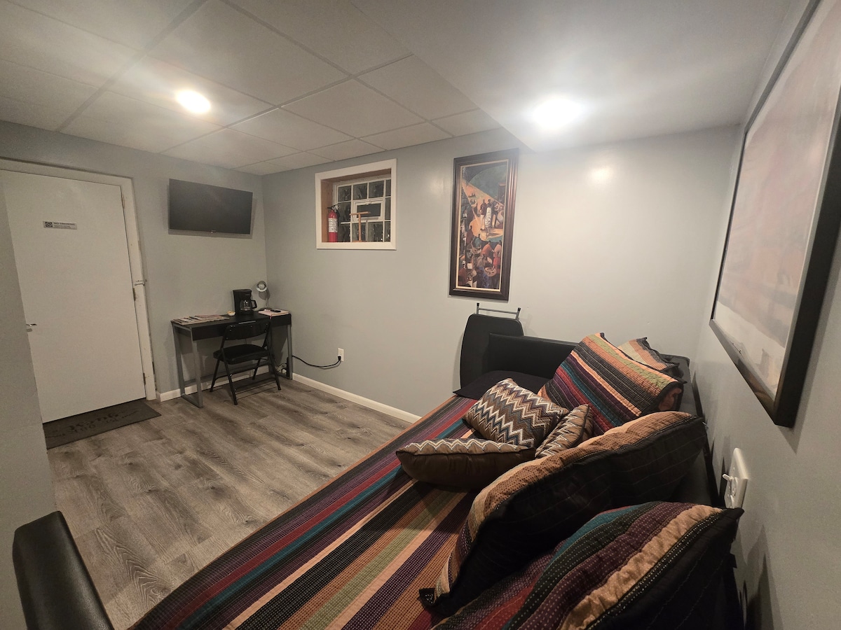 This is an Apartment /Mother in law suite that is connected to my home. You have a separate Front and Back door. One bedroom, Full kitchen, queen bed, and queen sofa bed in the livingroom. Driveway Parking. Backyard and Sun porch are shared spaces that includes a huge in-ground pool, trampoline, beautiful screened in sun porch, outdoor dining, fire pit, hot tub, and the backyard is fully fenced in. The pool is now open! Laundry and Ev Charger can be used for a fee.