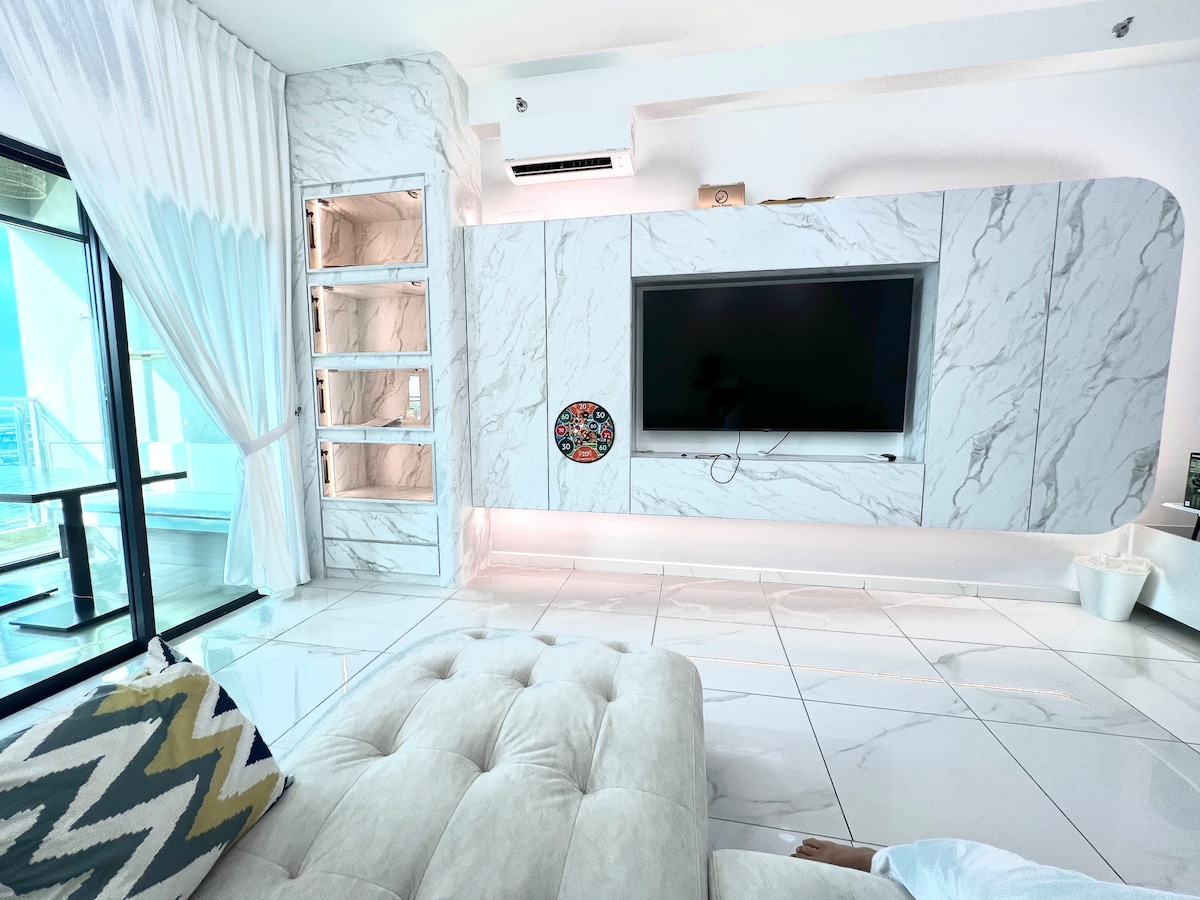 *檳城的最佳位置,新關仔角,第一旅遊目的地 *一個雙層角落單位 *令人驚嘆的高樓層日出海景 *日本設計師設定,配備全套設施 *智慧電視 * 100Mbps WIFI *在臥室、客廳和餐廳欣賞令人驚嘆的日出 *周圍有酒店、購物中心和各種當地餐廳 *免費1個室內停車場 *設施包括室內泳池、健身室和天空休息室 *放鬆的海濱漫步