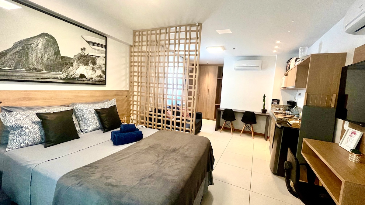 全新、全新裝潢、現代化和獨特的風格。 Studio Acqua位於Niterói最好的街區,位置優越,步行2分鐘即可抵達Icaraí木板路。 靠近超市、藥店、酒吧、餐廳和商場。 輕鬆前往海灘和市中心。 單間公寓有一張舒適的雙人床(01)和一張雙人沙發床(01)。 新建築,提供免費停車位代客泊車。 非常適合旅客、高管和情侶入住。