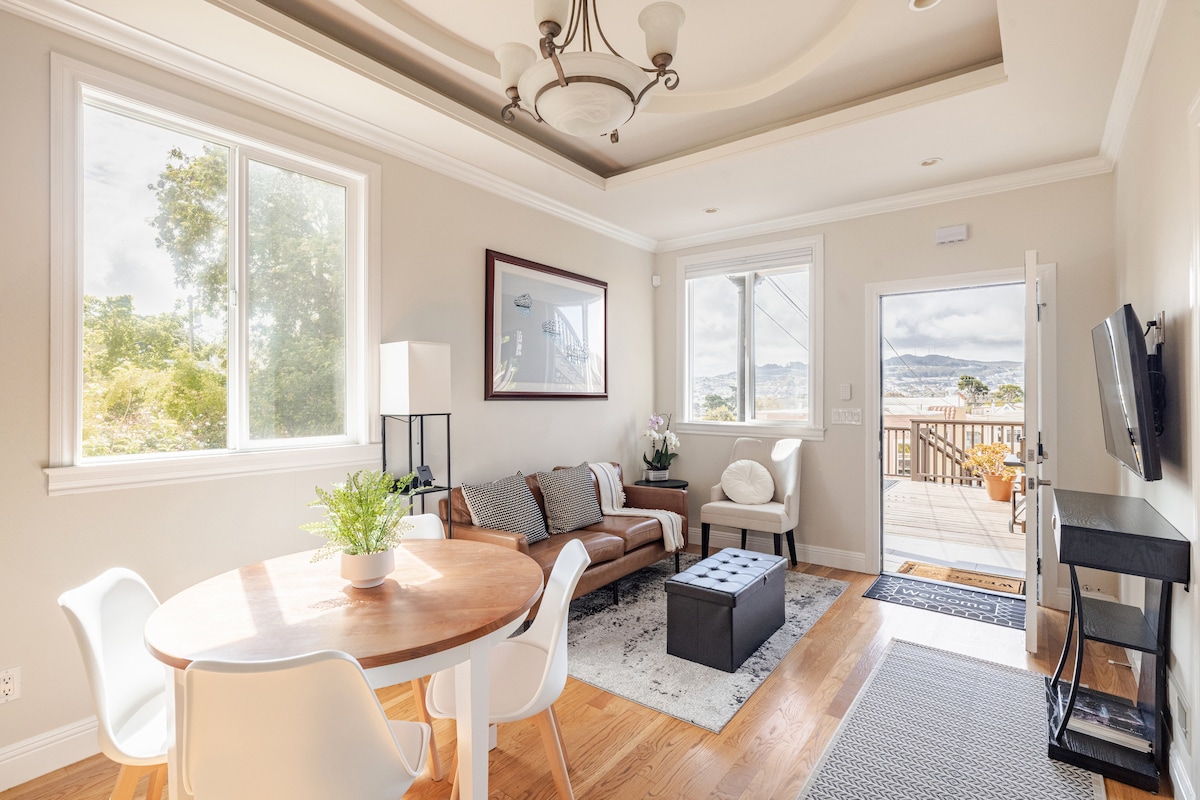 單間公寓(一樓車庫通道) ,獨立浴室,鬱鬱蔥蔥的私人露臺。 Bernal Hts是舊金山的一個時尚村莊。 Bernal有一些最時髦的酒吧、餐廳和公園可供選擇,不僅是城市樞紐的便利,而且公共交通非常方便。 單間公寓總是經過專業清潔。 提供羽絨枕頭、羽絨被和優質的降落傘或布魯克林牀上用品。 * *共用大樓入口-公寓入口是私人的。