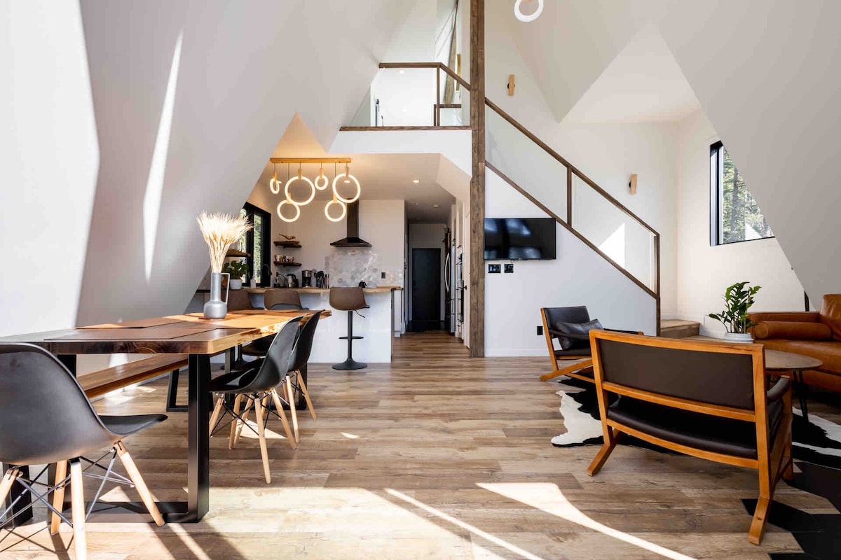 現代A字型小木屋,結合了鄉村特色和現代特色,可欣賞山景。 在這裡,您的靈魂和身體可以從繁忙的城市生活中放鬆身心。 雪松桶桑拿房可欣賞全景,為您提供獨特的機會,提升您的小木屋體驗。 體驗夜空,如果您幸運的話,可以從巨大的天窗窗戶或甲板上欣賞北極光。