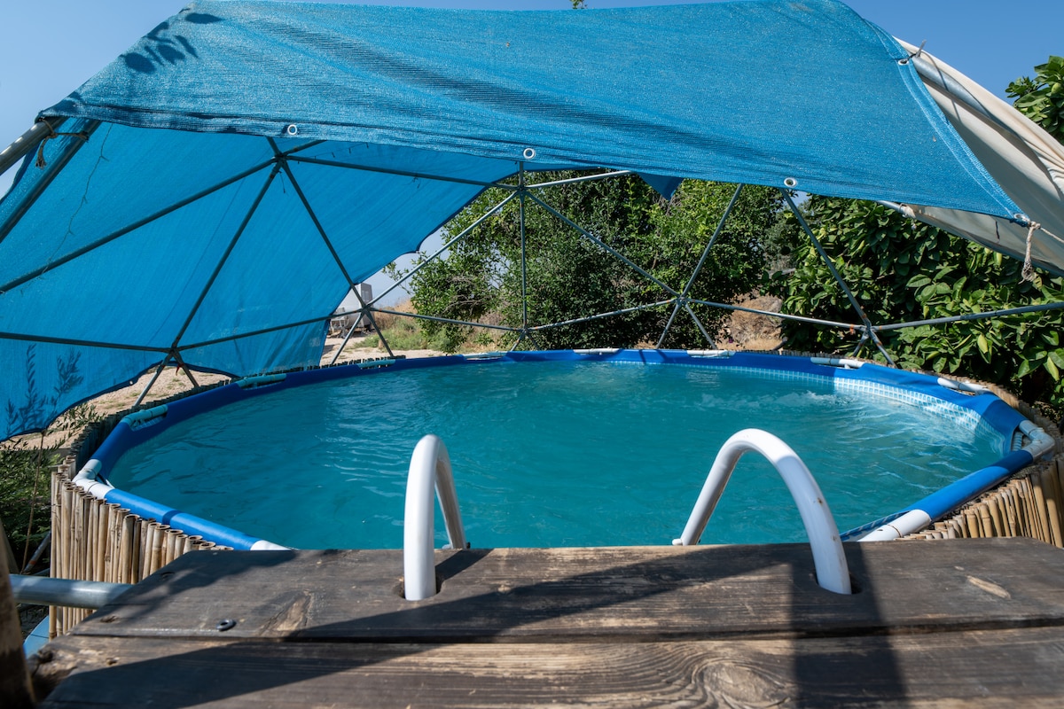 測地線穹頂位於我們的生態農場- Nachat Ruach Eco Farm。 住宿期間,您可以在農場享受獨特的體驗,欣賞吉爾博亞山脈的美景,在月光下點燃篝火,並與農村氛圍相連。 穹頂配有空調,包括寬敞的睡眠空間、休息區和咖啡角。 外面有一片年輕的可食用森林、營火休息區、戶外廚房和生態裝飾泳池