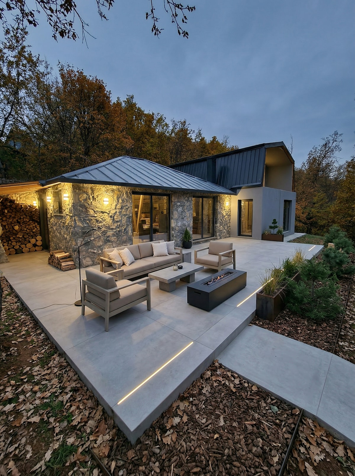 Modern-rustic villa surrounded by nature, combining natural stone charm with clean contemporary design. Enjoy a cozy interior with warm lighting, fireplace, and stylish living space. Step outside to a private patio perfect for relaxing or dining. Peaceful forest setting, ideal for a quiet escape, romantic stay, or getaway with friends and family.