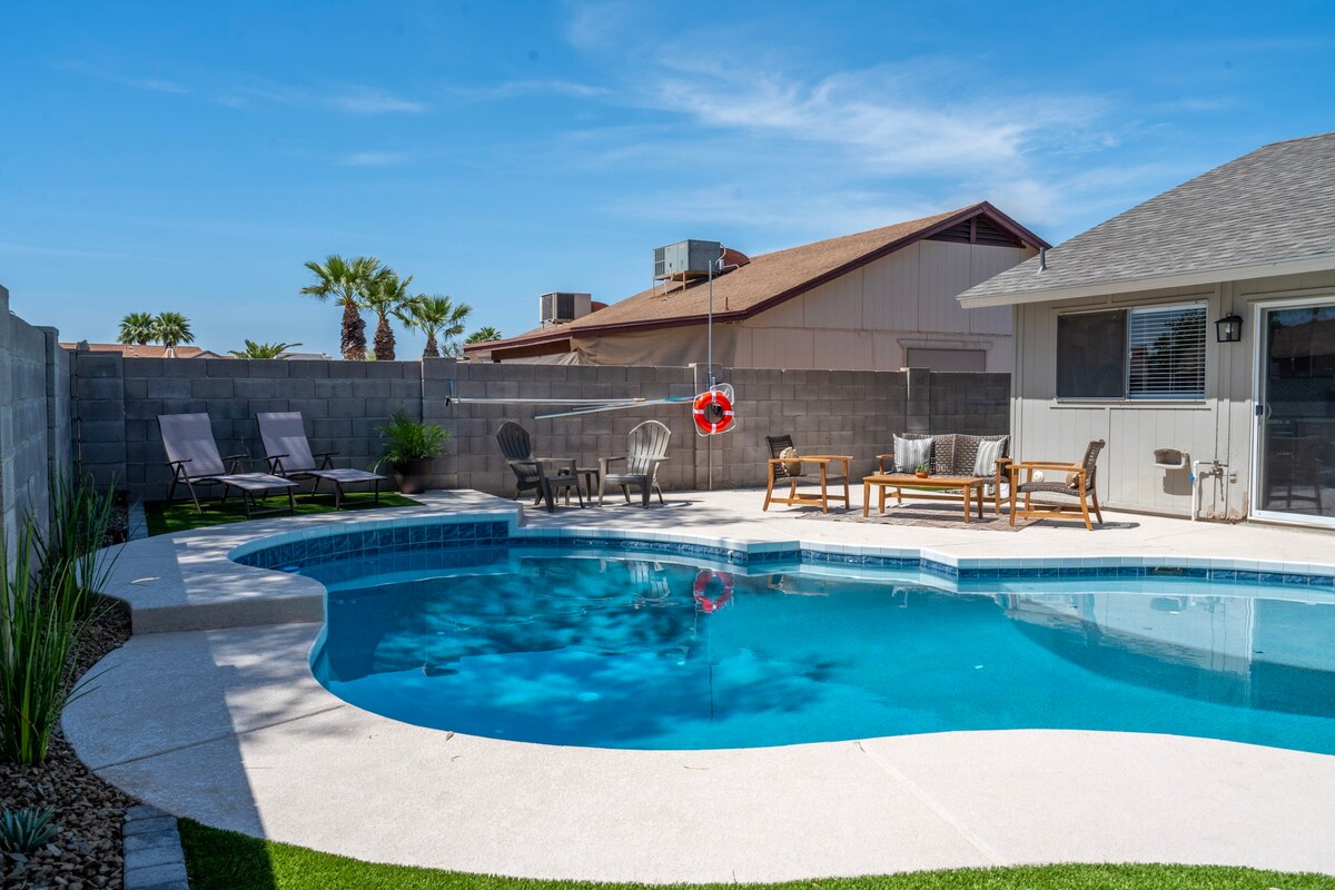 歡迎來到沙漠中的手工房源。有一個很大的戶外區域,配有溫水泳池、烤肉和丙烷火桌。10月至5月期間,泳池的暖氣費用包含在住宿費用中。您可以在設備齊全的廚房中享受娛樂,配備最新的電器和烤箱中的空氣炸鍋。舒適的床鋪是記憶泡綿,浴室都已更新。跳過比賽日/音樂會交通,選擇輕鬆步行。我們距離州立農場體育場(State Farm Stadium)0.8英里。