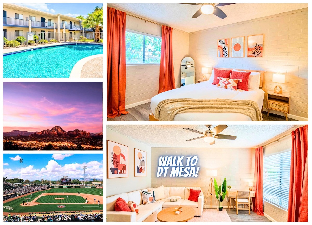 舒適的小公寓,位於梅薩市中心附近。 靠近餐廳🍔、商店🛍️、棒球⚾️場和各種景點。 家具齊全,有2間睡房,每間都有1張大床、步入式衣櫃和附近的浴室。 廚房設備齊全,可烹飪小型用餐區。 小型洗衣機/烘乾機。可使用HBO Max和Hulu。 小型半遮蔭露台。 旅人還可以使用社區泳池和按摩浴池。 寵物友好,適合小狗入住🐕。