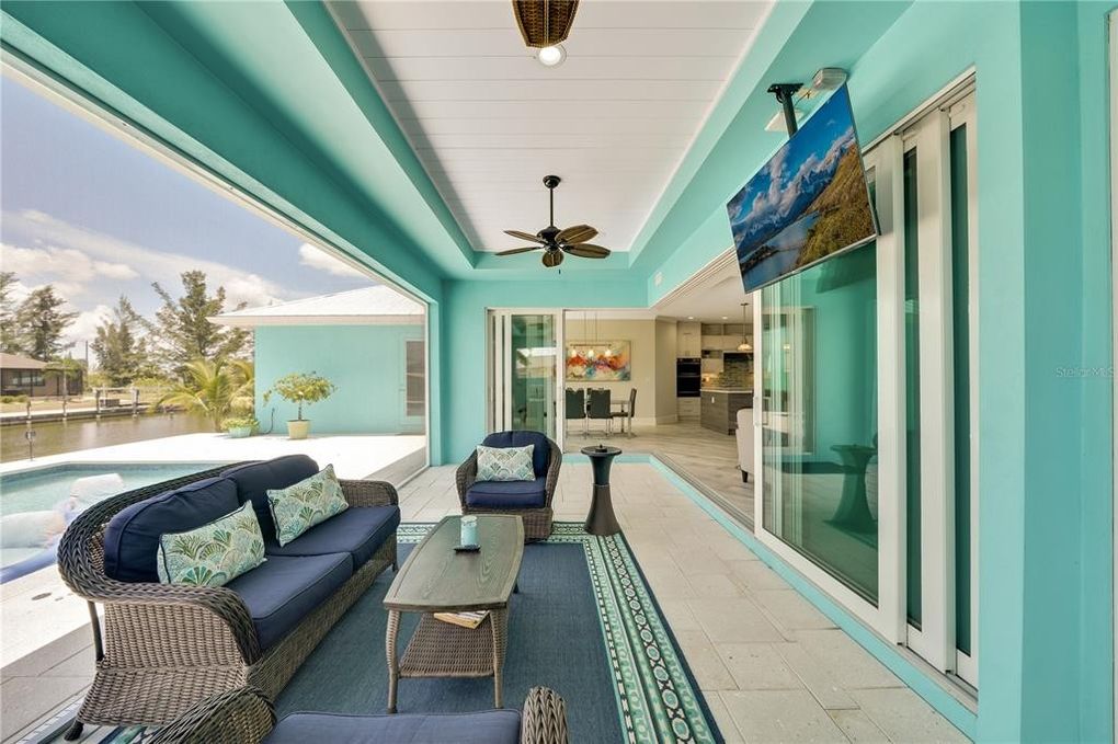 The living room has a 65 " smart TV,wall mounted with a LCD Fireplace below with surround sound- All TV's have Netflix.The bar room has a small refrigerator,pool table and dart board.Outside has a private lanai with Heated pool and a propane firepit.Enjoy the sonos sound with 55" smart TV in the Master bedroom the second bedroom also has a TV. The bar room,also has sonos as well as the lanai.30 minutes from several beaches.The garage will not be available.Home located in a quiet Cul de Sac