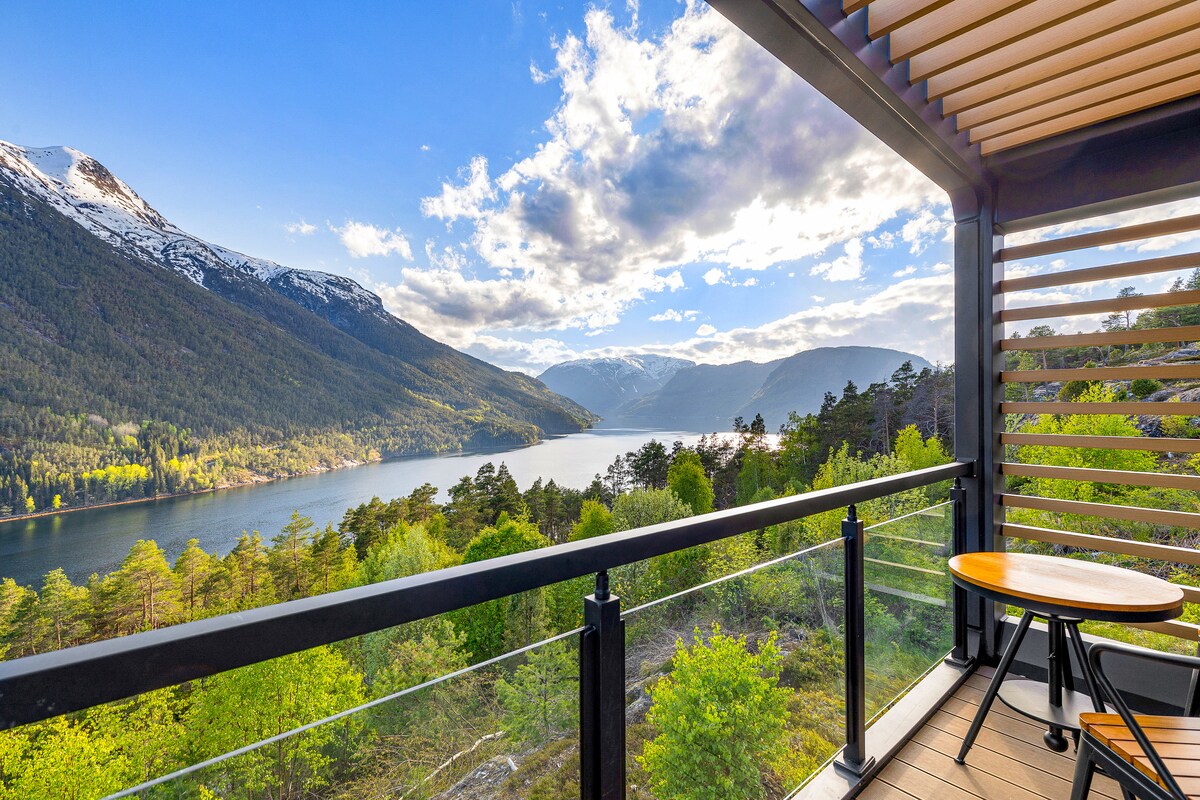 Sogndal Fjordpanorama - The View提供獨特的體驗,懸掛在世界上最長的峽灣。 全新的小木屋配有奢華的風格,並配有私人按摩浴缸。 設備與服務: -按摩浴缸。加熱,可供全年使用。 冬天和夏天一樣好! -配備投影機的120英寸畫布 -全套廚房,配有爐具、烤箱和迷你冰箱。 - 150x200牀 -配備加熱瓷磚的豪華浴室 -包括飯店品質的牀單和毛巾。