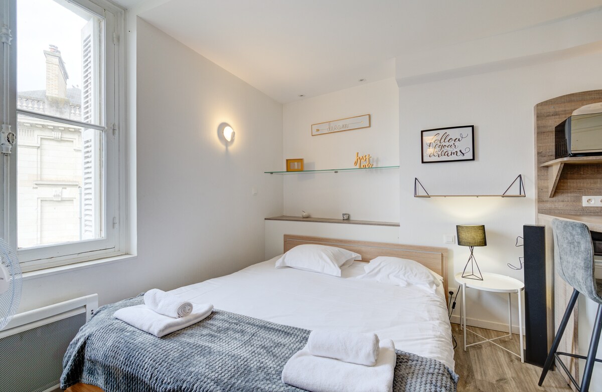 在聖加蒂恩大教堂歷史區的中心,以及16世紀的石頭和木材建築中, BELL ART是一個充滿舒緩色彩的生活空間:白色和黑色與天然木材混合。 陽光透過大窗照進來,窗外就是巴黎美術宮區的美麗住宅露台。 為了讓您在這個安靜的地方住宿愉快,一張大床(160/200 )配有非常舒適的床墊