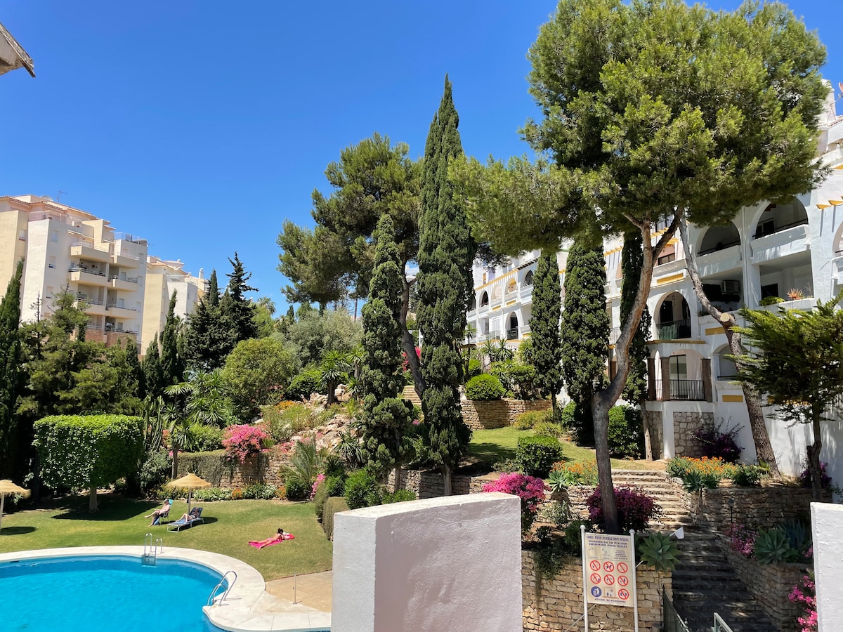在美麗的馬貝拉鎮和充滿活力的巴努斯港之間的著名黃金一英里上,您會找到一個小型綠洲,可以放鬆身心。步行僅需3分鐘即可抵達該地區最美麗的海灘之一,有很多酒吧和餐廳。您可以沿著海灘漫步到巴努斯港(Puerto Banus),或在附近打高爾夫球。泳池僅與半獨立式房屋的其他部分共用。此外,私人停車位和露臺正在等著您!