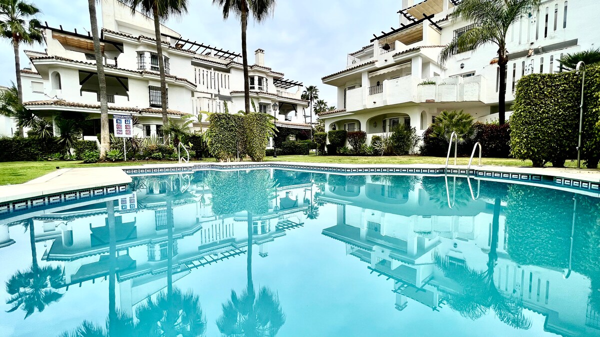 Cozy, bright, entirely renovated quality flat on the front line with sea views from the sunny and large balcony, both rooms and the bathroom. Features his and her shower, full kitchen, 2 tennis courts, 2 swimming pools (1 for children) large gardens, private beach area, free beach beds and private parking. We have a sandy beach with Blue Flag status and direct access to the sea boardwalk. Near Marbella and La Cala with 75+ restaurants and many shops walking distance. Strict cleaning protocols.
