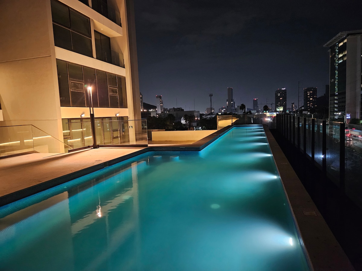 享受蒙特雷市中心的現代公寓。 位於設有泳池、露台、健身房和休息室的建築群。 適合寵物入住,設有設備齊全的廚房、電視區、高速WiFi、有線電視和Netflix。 從客廳和主臥室,欣賞美麗的Sierra Madre景觀。 非常適合短期或長期住宿。 您一定會喜歡的!