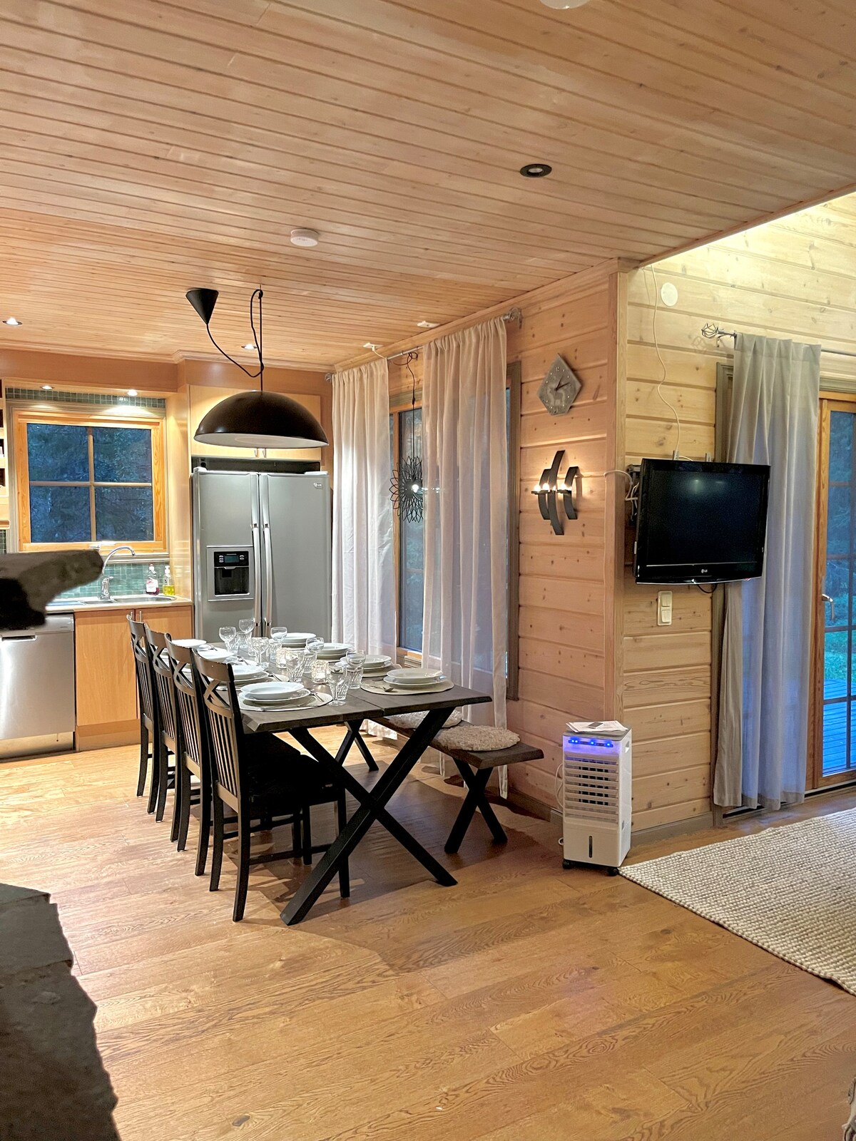 現代冰屋風格小木屋,配有玻璃屋頂。屋頂加熱,確保您可以輕鬆欣賞北極光、星星或美麗的山景。 擁有私人桑拿房和戶外按摩浴缸,帶來額外的奢華。 38 平方公尺的小屋,包括一張 180 公分的床在陽臺上和一張 140 公分的沙發床。 設備齊全的廚房,配有洗碗機。 免費Wi-Fi、停車位和帶烘乾機的洗衣機。 價格包括最後的清潔、床單和毛巾。 Ig: levinloihtu