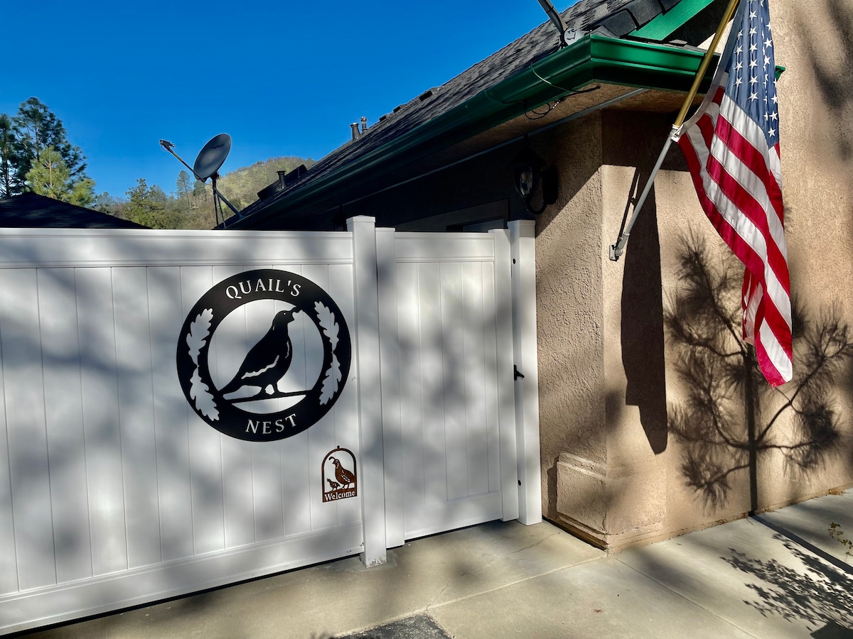 我們舒適的客用住房坐落在山中,四周環繞著樹木...私人後甲板俯瞰季節性小溪...距離巴斯湖2英里...距離約塞米蒂大門11英里...距離奧克赫斯特鎮5英里...坐落在2英畝的寧靜、安全和安靜的房源上。 可使用整套客用住房和周圍區域。 功能齊全的廚房,包括keurig、烤麵包機、鍋具、餐具等。 房東在現場,可根據需要提供協助。 提供露營車和船舶停車位。