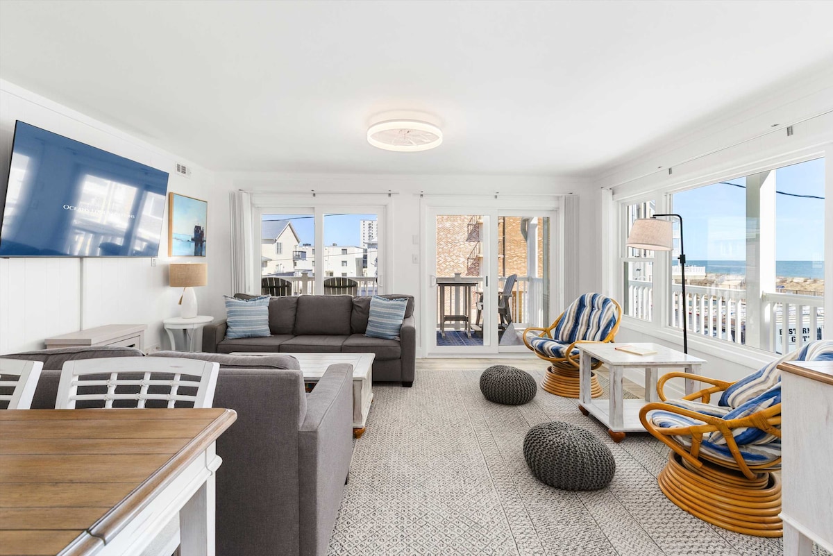 Book 3 nights, get 1 night FREE stays thru April 16. inquire before booking OCBeachfrontRentals, com premier property. 24/7 support, linens & towels provided. Perfect Family Friendly Beach House! 4bd/3.5ba renovated waterfront home sleeps 14 guests comfortably! Enjoy a fully updated kitchen and baths, plus 2 private furnished patios with water views. Just one block from the beach and walking distance to top restaurants and attractions. Must be 25+ unless accompanied by an adult.