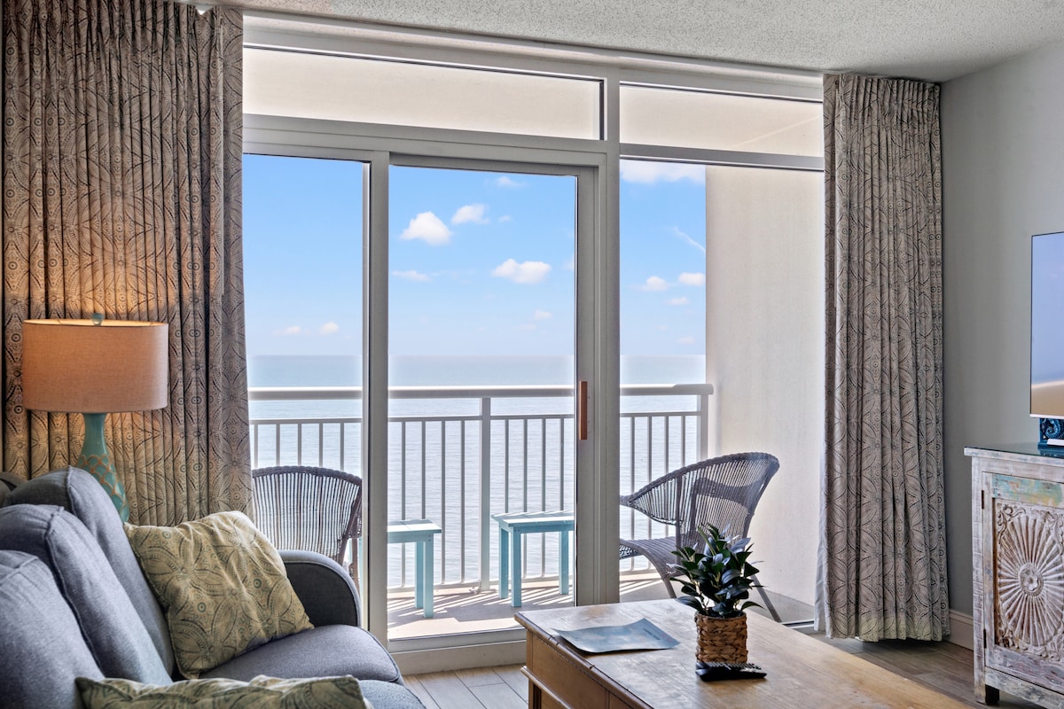 明亮、現代化的海濱度假勝地,一切都感覺簡單舒適。 享受開放式景觀、簡潔設計,以及讓你在海邊放鬆身心的休閒空間。 默特爾海灘排名前5%的飯店 🌴 海濱豪華—Seawatch Resort 1003 North Tower • 🌊從地板到天花板的海景,讓海灘成為焦點 • 🛋 明亮、現代化的生活空間,設計開放、簡單、舒適 • 🛏私人臥室,配有舒適的特大床,讓您安然入睡 • 🍳 設備齊全