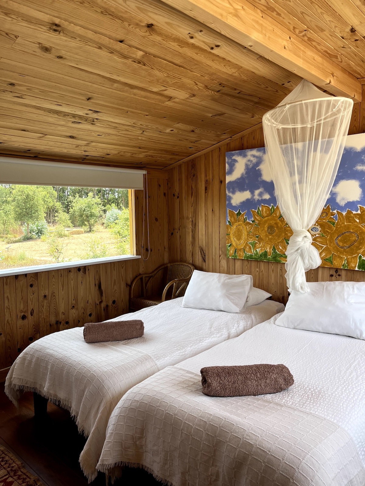 A casa Girassol é uma pequena casa feita de madeira no meio da natureza, nesta casa irá encontrar um quarto amplo com 2 camas individuais e a possibilidade de uma cama extra com valor acrescido bem como um wc privativo. A cozinha partilhada localiza-se a cerca de 40 metros do quarto e está equipada para confecionar refeições, e a cerca de 60 metros irá encontrar a piscina partilhada onde poderá desfrutar de um bela manhã de sol no meio da natureza. O pick-up point é na Zambujeira do Mar.