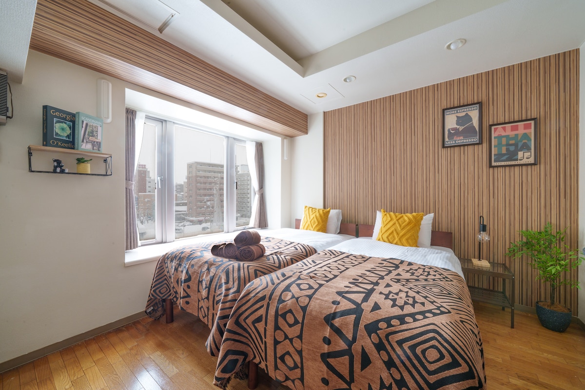 *札幌中心部*美しい川の眺め*快適な2BR*薄野徒歩5分*狸小路徒歩10分*Wi-Fi*長期滞在*
