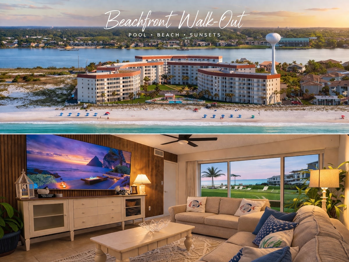 Relax and getaway to this beachfront condo retreat on Okaloosa Island in Fort Walton Beach, Florida. Just steps to the sugar-white sand and emerald Gulf coast waters, this updated 2BR/2BA condo features a private balcony with dolphin & sunset views, modern kitchen, Wi-Fi, washer/dryer, and pool (heated in the winter). Free beach service (2 chairs + umbrella, Mar–Oct). Only 5 miles to Destin! Please note - Roof repairs for the condo are ongoing from 2/16/2026 and expected to be completed May 5/