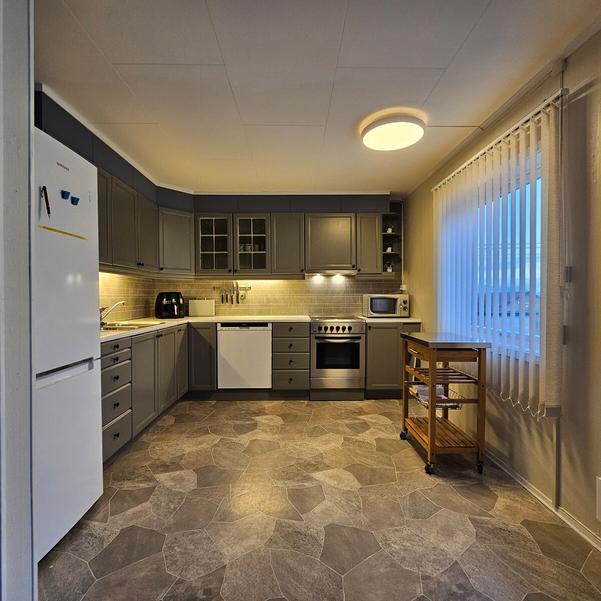 Sock公寓,有獨立入口、臥室、客廳、淋浴間、桑拿房和馬桶。 客廳有冰箱、微波爐和水壺。 客廳還有一張沙發牀,可以用作牀。 對於過敏症患者,請注意樓上有一隻狗。 步行5分鐘即可抵達市中心,有巴士站、商店和餐廳。 10分鐘即可抵達Finnmarkshallen、UiT和徒步區域。 房子有停車位。 自行車和摩託車可以停在上鎖的車庫。 附近有電動車充電器。
