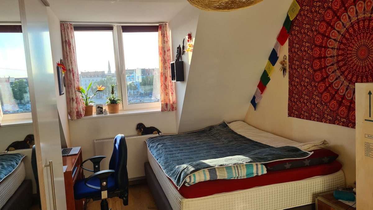 Wir bieten unsere schöne Einliegerwohnung im Dachgeschoss unseres renovierten Doppelhauses mit Garten an. Die Einliegerwohnung mit eigenem Badezimmer (Dusche / WC) und kleiner voll ausgestatter Küchenzeile verfügt über alles was man für einen kurzen Aufenthalt benötigt. Wir wohnen selbst im Erd-/Obergeschoss, sprechen Deutsch, Englisch, Russisch, Türkisch, und ein wenig französisch. Bei euerer Buchung erklärt bitte etwas genauer was ihr vor habt und wer genau anreisen wird. Danke!