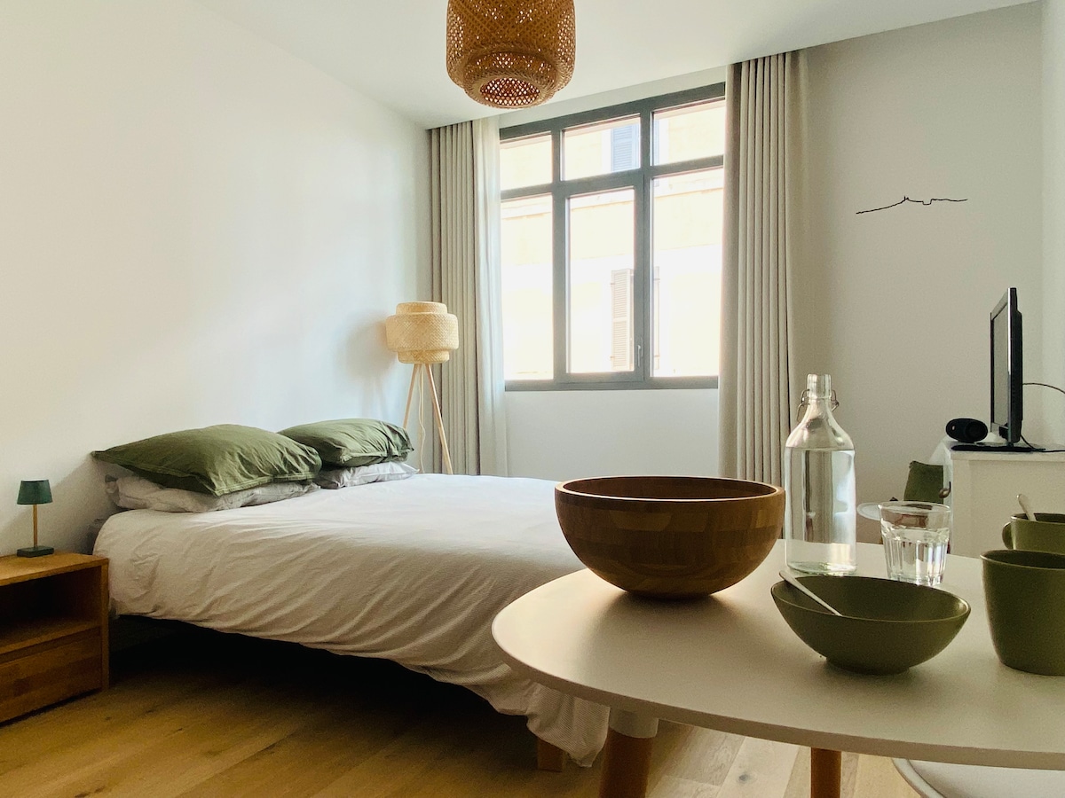我們迷人的公寓位於Le Panier和Old Port之間,結合了個性和舒適性。 非常適合2位房客入住,您將享受其中心位置和正宗的馬賽感覺。 穿過上市的庭院和石頭噴泉,然後到達公寓,坐落在一棟擁有500年歷史建築的3樓和頂樓的屋頂下。 請注意,最後兩層樓沒有電梯,樓梯陡峭,不適合行動不便的房客。