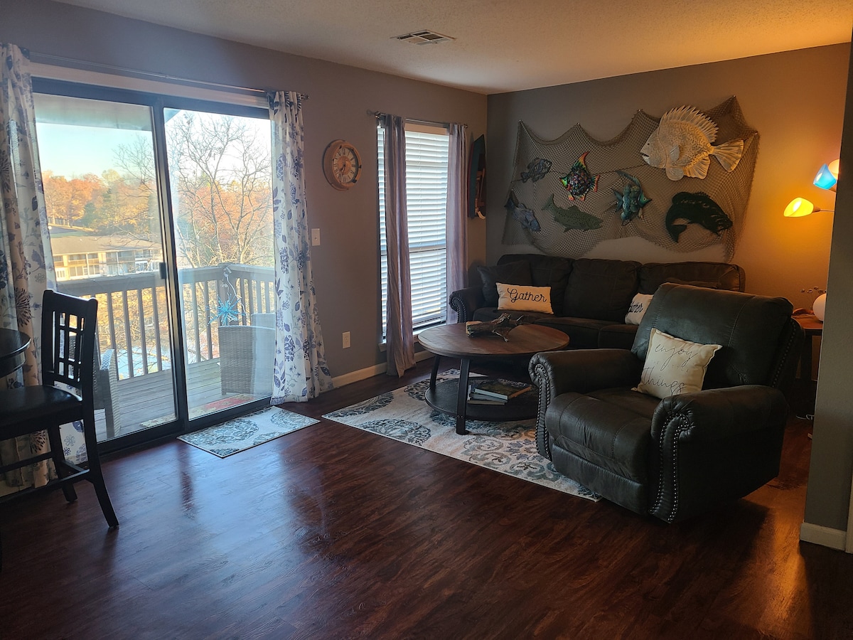 Peaceful, centrally located newly renovated walk-in 1 bedroom Condo ideal for couples or small families. This beautiful getaway includes new flooring, a kitchen, a queen size sleeper sofa, a heavenly reclining chair to unwind while watching the big screen TV. Enjoy a great night's sleep in a luxurious king size bed. Located just minutes from the Entertainment District, fabulous dining and shopping options, Lake Taneycomo Marina and hiking, fishing, boating and swimming at Table Rock Lake.