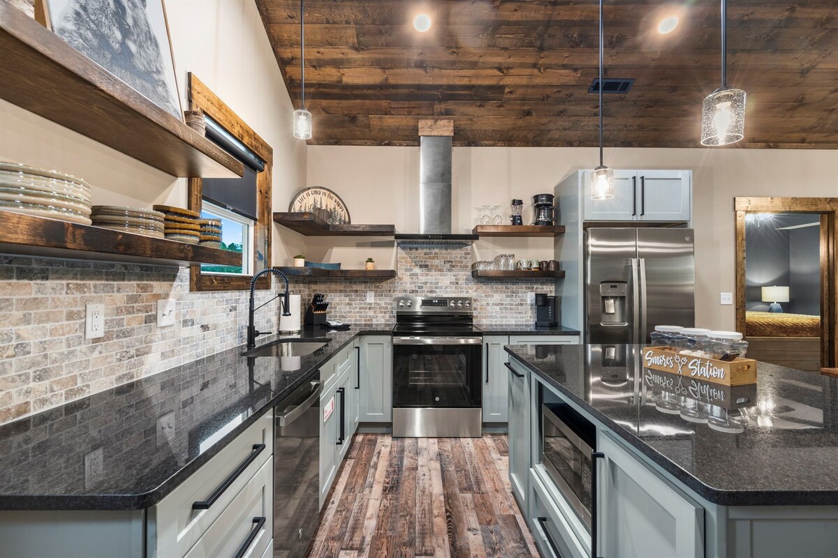 Nestled among the rolling hills only a quick drive to the heart of Branson sits this peaceful 2 bedroom cabin with breathtaking views of Table Rock lake. This newly constructed cabin offers a serene escape from the hustle and bustle of daily life. With modern yet elegant decor, the cabin exudes warmth and coziness, inviting guests to unwind and embrace the beauty of nature. Floor-to-ceiling windows with incredible views make this a one-of-a-kind experience you won’t want to miss out on.