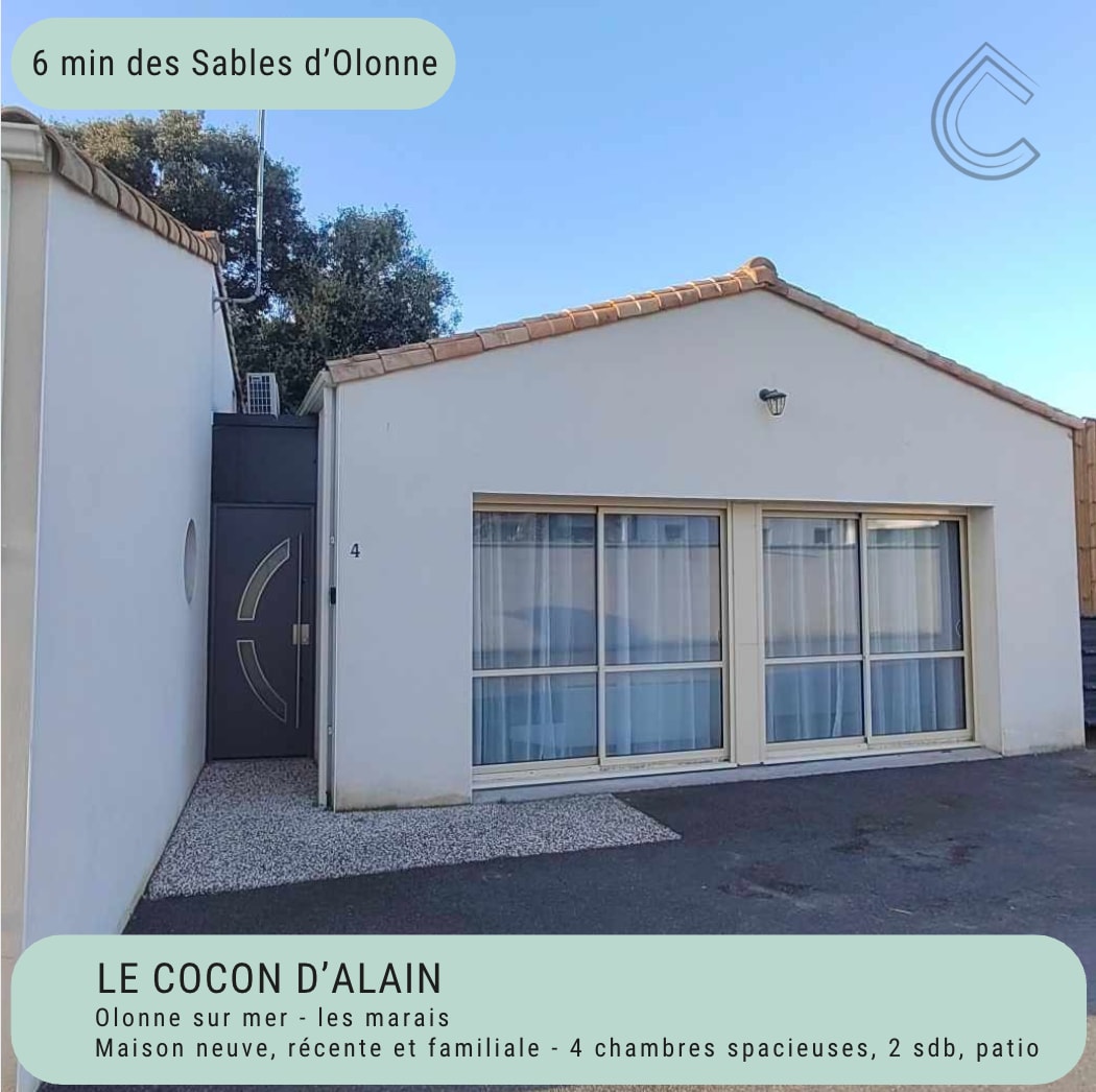 Maison individuelle située à quelques minutes de la plage de Sauveterre et des Marais des Sables d'Olonne et vous offrira un séjour paisible à la mer sur la plus belle côte Vendéenne. Ce spacieux pavillon récent et tout confort vous offre une cuisine toute équipée, un spacieux salon, quatre belles chambres, wc séparés et deux salles de bains avec douche italienne et également un superbe patio à l’abris des regards pour passer d’excellents moments à l'extérieur. Navette/bus devant la maison !